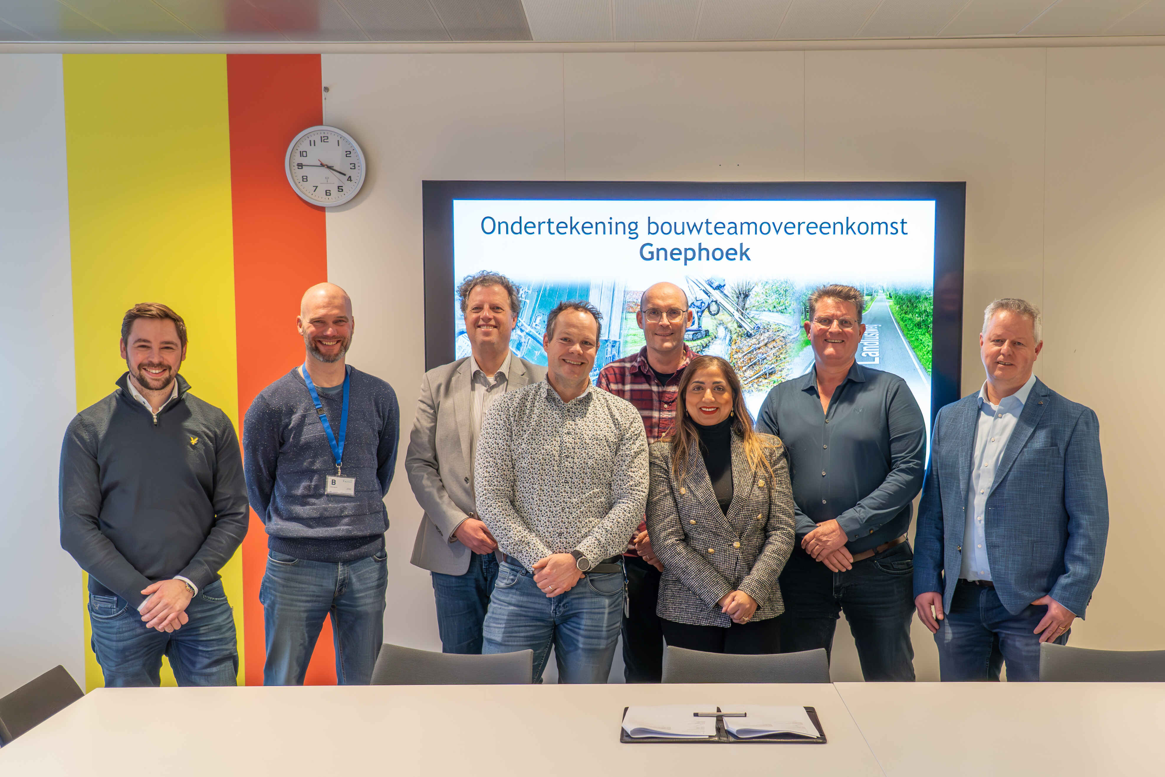 Op 3 februari is de overeenkomst met het bouwteam voor de dijkverbetering Gnephoek ondertekend. Dit is niet zomaar een bouwteamovereenkomst, maar eentje waar dijkvernageling in is opgenomen. En dit is uniek! Resultaatmanager Niels Minnen heeft namens Rijnland getekend en directeur JLD Contracting B.V. Jos Karsten en directeur FPH Ploegmakers Gerbert Ploegmakers tekenden namens het bouwteam.