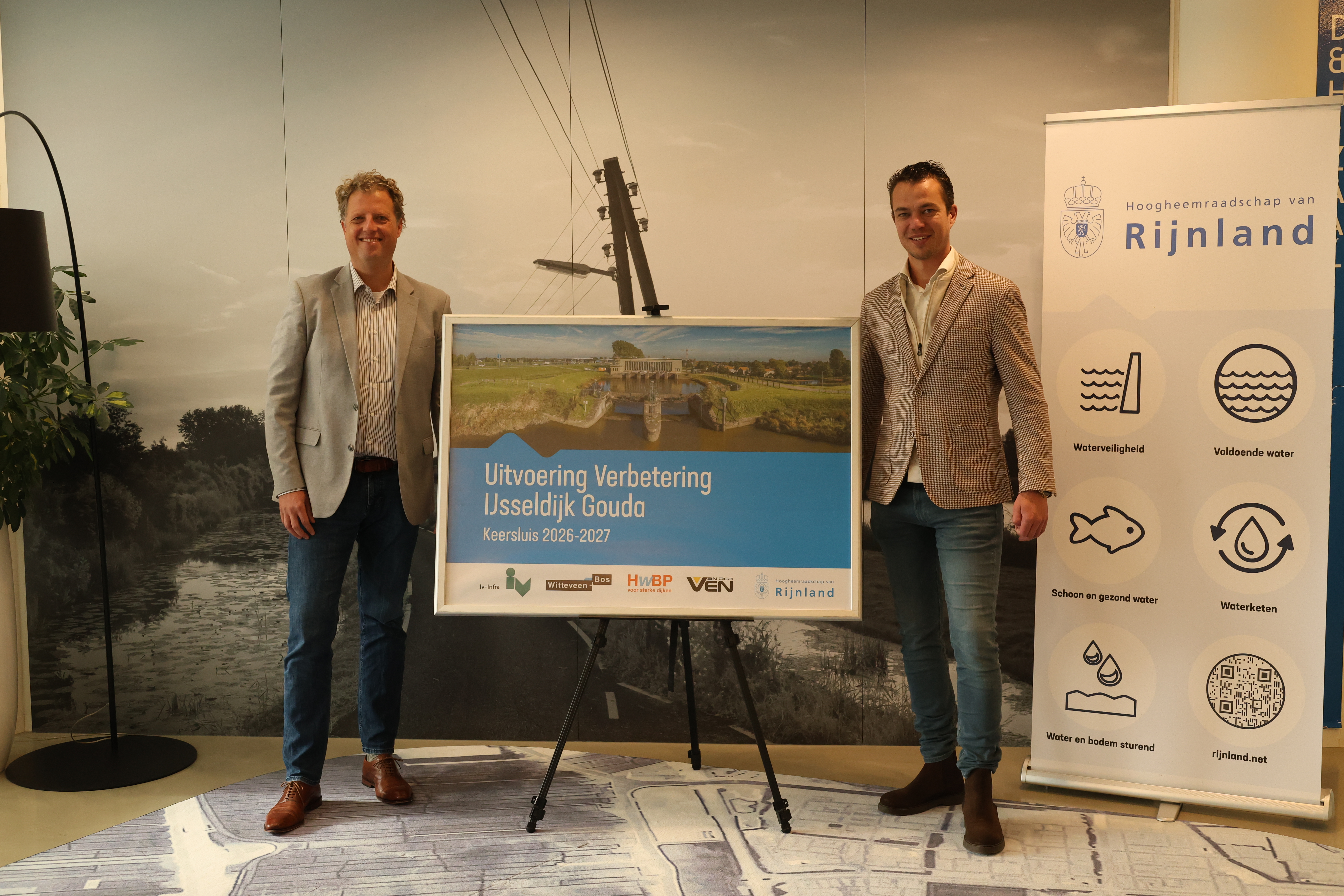 De opdrachtbrief voor de uitvoering van de renovatie van de Keersluis in Gouda is dinsdagmiddag overhandigd door de Resultaatmanager van het hoogheemraadschap van Rijnland Niels Minnen. Martin den Otter, directeur van aannemersbedrijf Van der Ven, mocht deze aannemen. Het bouwteam, bestaande uit Van der Ven, Iv-Infra B.V., Witteveen+Bos en Rijnland, heeft hard gewerkt aan het ontwerp van de renovatie en het resultaat mag er zijn. Tevens is er een intensieve samenwerking geweest met TAK Architecten en het begeleidingsteam van het hoogwaterbeschermingsprogramma (HWBP) om tot dit resultaat te komen. In februari 2026 starten de werkzaamheden buiten.