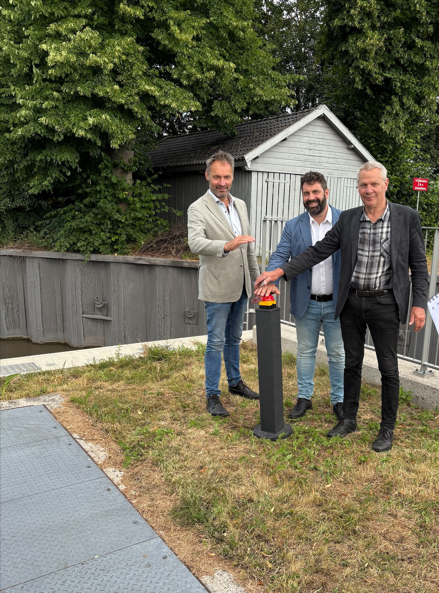 Hoogheemraad Aad Straathof (Rijnland), hoogheemraad Bert de Groot (HDSR) en afdelingshoofd Jos Stammen (RWS Midden-Nederland Zuid) zetten de Klimaatbestendige Wateraanvoer aan bij gemaal de Aanvoerder in Utrecht. Het gemaal de Aanvoerder is speciaal gebouwd voor de zoetwateraanvoer naar het westen.