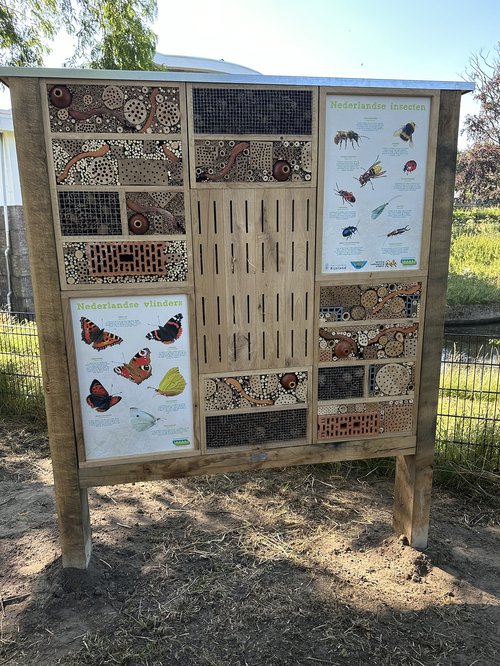 Er zijn verschillende elementen toegevoegd, zoals schelpenpaden, gietranden met anti-worteldoek, en het planten van struiken, boompjes en vlinderplanten. Daarnaast zijn voederhuisjes en egelkasten geplaatst en is er een groot insecten- en vlinderhotel geïnstalleerd, met ons logo als subsidiegever. Ook het herplaatsen van het informatiebord over Gemaal Leeghwater en de toevoeging van nieuwe bankjes en nestkasten dragen bij aan de verduurzaming en biodiversiteit van het park.