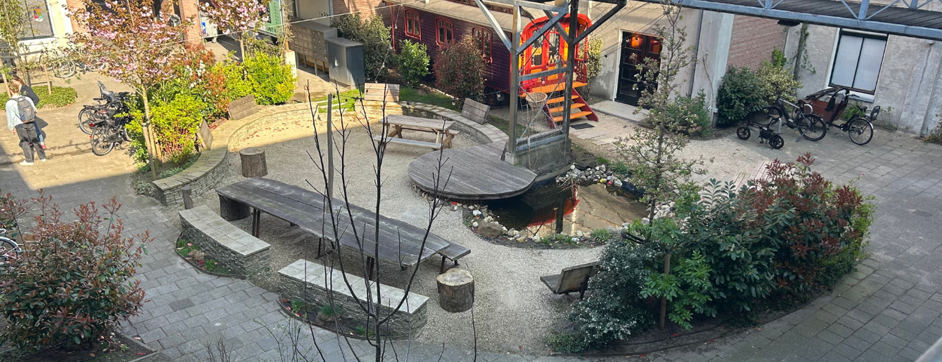 Op het bedrijvencentrum in Leiden is er een prachtige binnentuin gecreëerd. De planten zorgen voor een gezellige werkomgeving en helpen natuurlijk bij met het opvangen van regenwater, vergroten van de biodiversiteit en het verlagen van de hittestress.