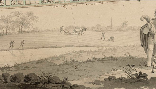 In 2022 kochten we bij een Amsterdams antiquariaat een prachtige aquarel: een weergave van de bouwput van de Katwijkse binnensluis ter gelegenheid van het ‘plechtig leggen der eerste stenen’ op 22 juli 1805. De binnensluis was onderdeel van de Katwijkse werken waarmee in de periode 1804-1807 een uitwatering op de Noordzee werd gerealiseerd. We kijken vanaf een duin neer op de sluisput, waar zich veel mensen verzameld hebben. Twee heistellingen zijn in gebruik, bij elke stelling trekt een groep mannen met vereende krachten het heiblok omhoog. Aan de rechterkant is een tribune opgericht voor het orkest dat is uitgenodigd om de feestelijkheden luister bij te zetten. Achter de sluisput zijn diverse tenten neergezet voor de genodigden, met als hoofdgasten natuurlijk dijkgraaf, hoogheemraden en hoofdingelanden van Rijnland. De plechtigheid trekt ook veel toeschouwers. Vanaf de omliggende duinhellingen slaan boeren, burgers en buitenlui het schouwspel gade.