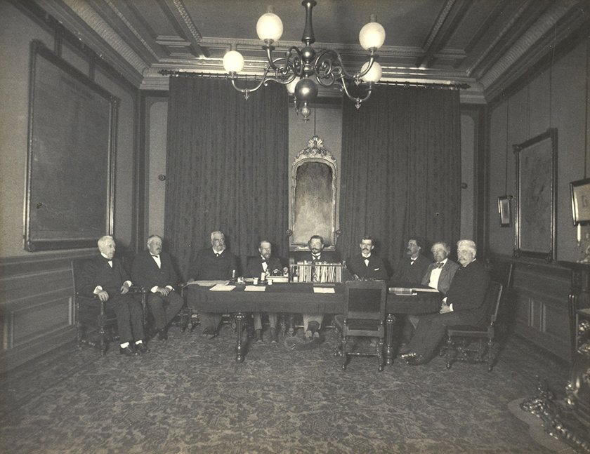 Foto van het bestuur met enkele hoge ambtenaren in de Kleine of Blauwe Zaal van het gemeenlandshuis in Leiden. Dijkgraaf E. de Vries zit in het midden. A.J. van der Stok, 1896. Beschikbaar via het archief van het hoogheemraadschap van Rijnland (FOTO-001076).