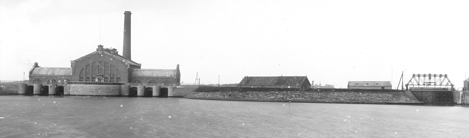 Foto van de schutsluis tussen het Noordzeekanaal en het IJ bij Schellingwoude met het stoomgemaal naast de Oranjesluizen. Beschikbaar via het archief van Waterschap Amstel, Gooi en Vecht (NL-AsdWAGV_020138).