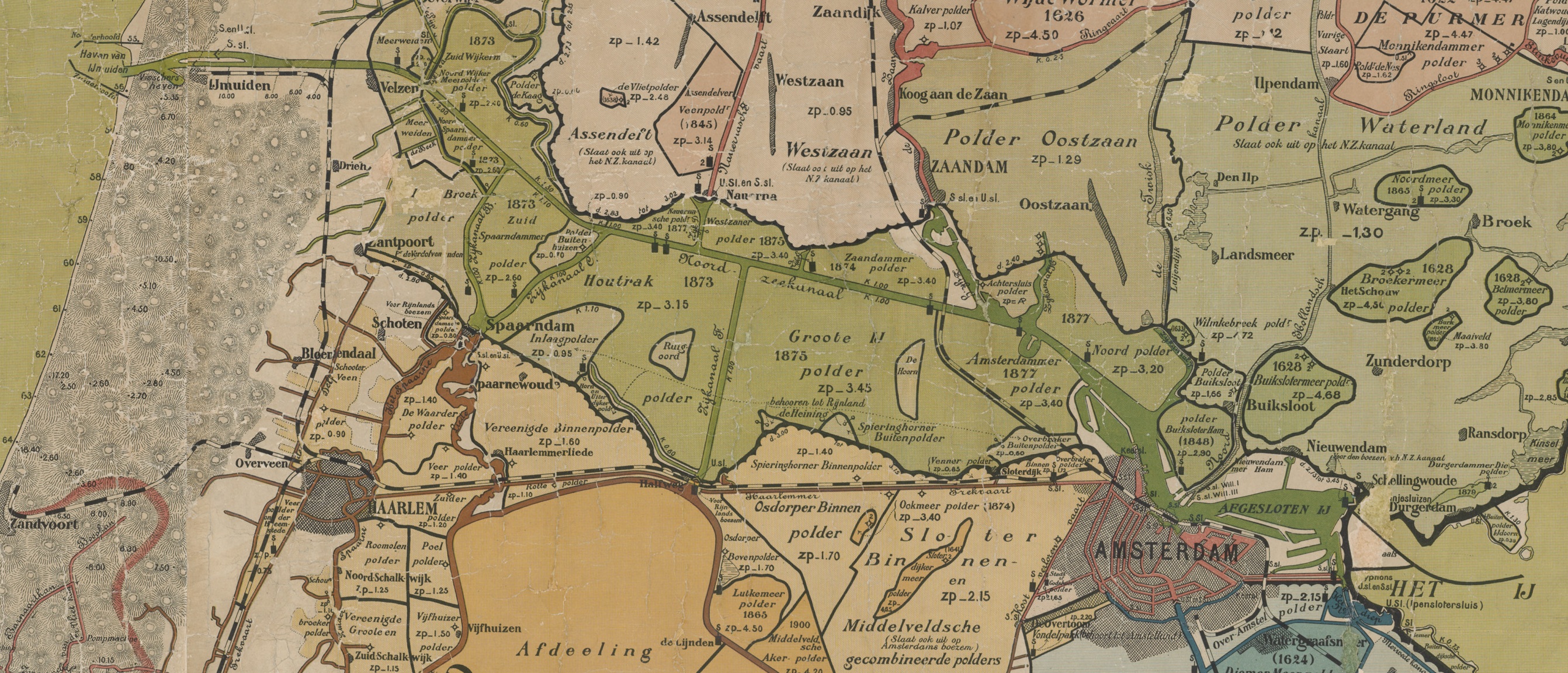 Fragment uit de ‘Polderkaart van de landen tusschen Maas en IJ’ met het Noordzeekanaal en de omliggende IJpolders. W.H. Hoekwater, 1905. Beschikbaar via het archief van het hoogheemraadschap van Rijnland (B-1873).