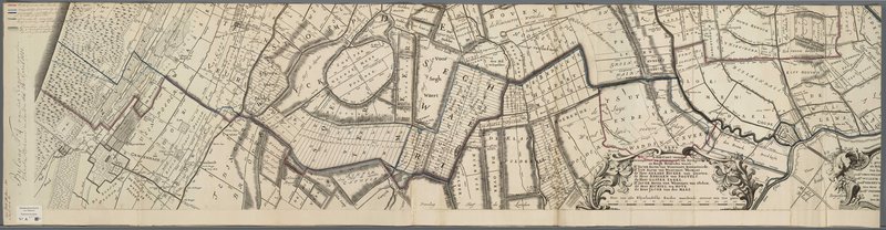 Figuur 3: Fragment uit ’t Hooge Heemraedschap van Rhynland, met aanduiding van de historische en voorgestelde grenzen van Rijnland met naburige waterschappen, vervaardigd door J. Kros, 1851. NL-LdnHHR, Collectie kaarten, A-2015.