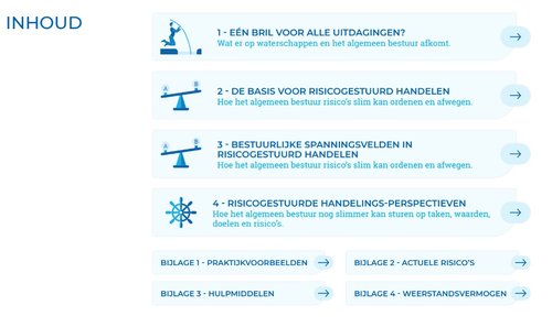 De meest recente inzichten in risicomanagement voor waterschappen zijn begin 2023 gebundeld in de handreiking ‘waarde(n)vol risicogestuurd handelen’ (deze is op te vragen bij Concern Control). De opdrachtgever voor deze publicatie zijn de 21 concerncontrollers .