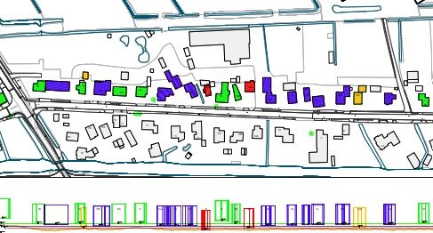 Dit voorbeeld toont de eerste variant. In deze variant wordt het midden van de weg opgehoogd. Vanaf de kant van de even huisnummers loopt de weg gelijkmatig op. Eerst zie je een parkeervak, daarna de rode rijbaan en vervolgens het hoogste punt in het midden van de weg. Hierna loopt de weg af naar een horizontaal lopende stoep. Vervolgens loopt de voortuin van de oneven huisnummers geleidelijk af tot de hoogte van de huidige bodem.