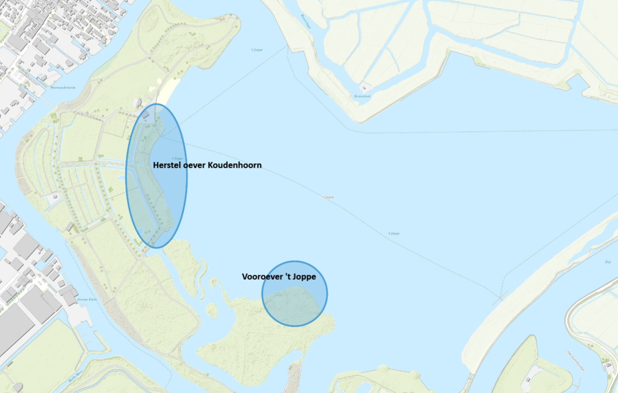 In 't Joppe leggen we leefgebieden voor planten en dieren aan. We herstellen bestaande oevers en richten een aantal plekken iets anders in. Meer waterplanten en -dieren in het water dragen bij aan meer biodiversiteit en uiteindelijk ook een betere waterkwaliteit. We voeren de volgende maatregelen uit in 't Joppe en langs Koudenhoorn: