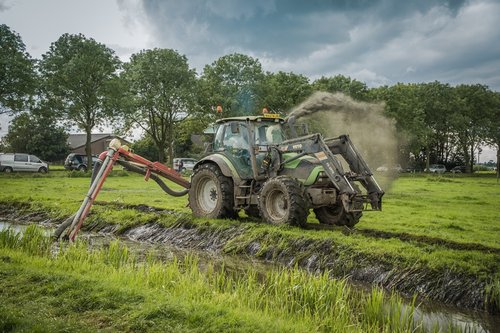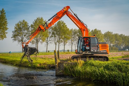 Heb je veel sloten? Gebruik een tractor met een baggerpomp en baggerspuit. Of gebruik een graafmachine met een bak met gaten.