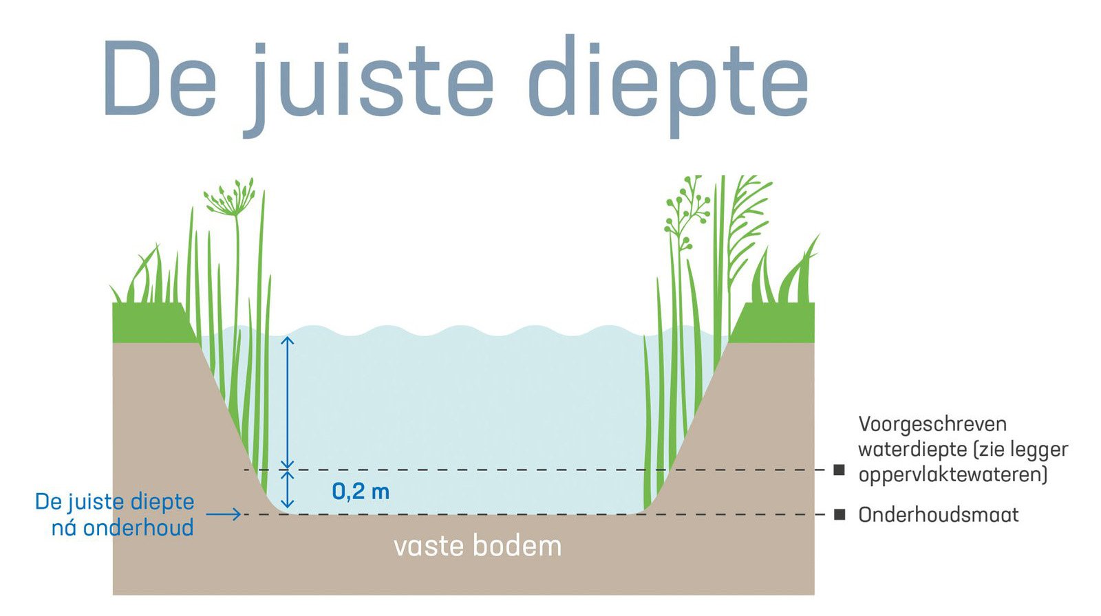 In de legger oppervlaktewateren (kaart) zie je de minimale waterdiepte. Bagger bij voorkeur 10 tot maximaal 20 centimeter onder die diepte. Zo blijft jouw sloot jaren diep genoeg. Verwijder de vaste bodem niet! Dat is de harde laag onder de bagger, zoals harde klei, stevig zand, veen, folie, beton of houten planken. Als deze laag breekt, kan grondwater omhoogkomen.