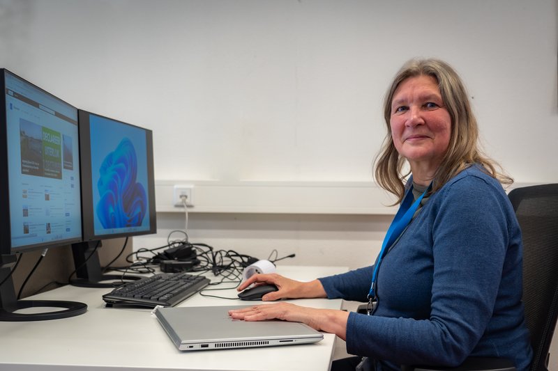 Op de foto: Ineke op kantoor