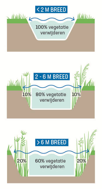 - Sloot smaller dan 2 meter: Verwijder alle planten (vegetatie). Laat geen planten in het water staan.